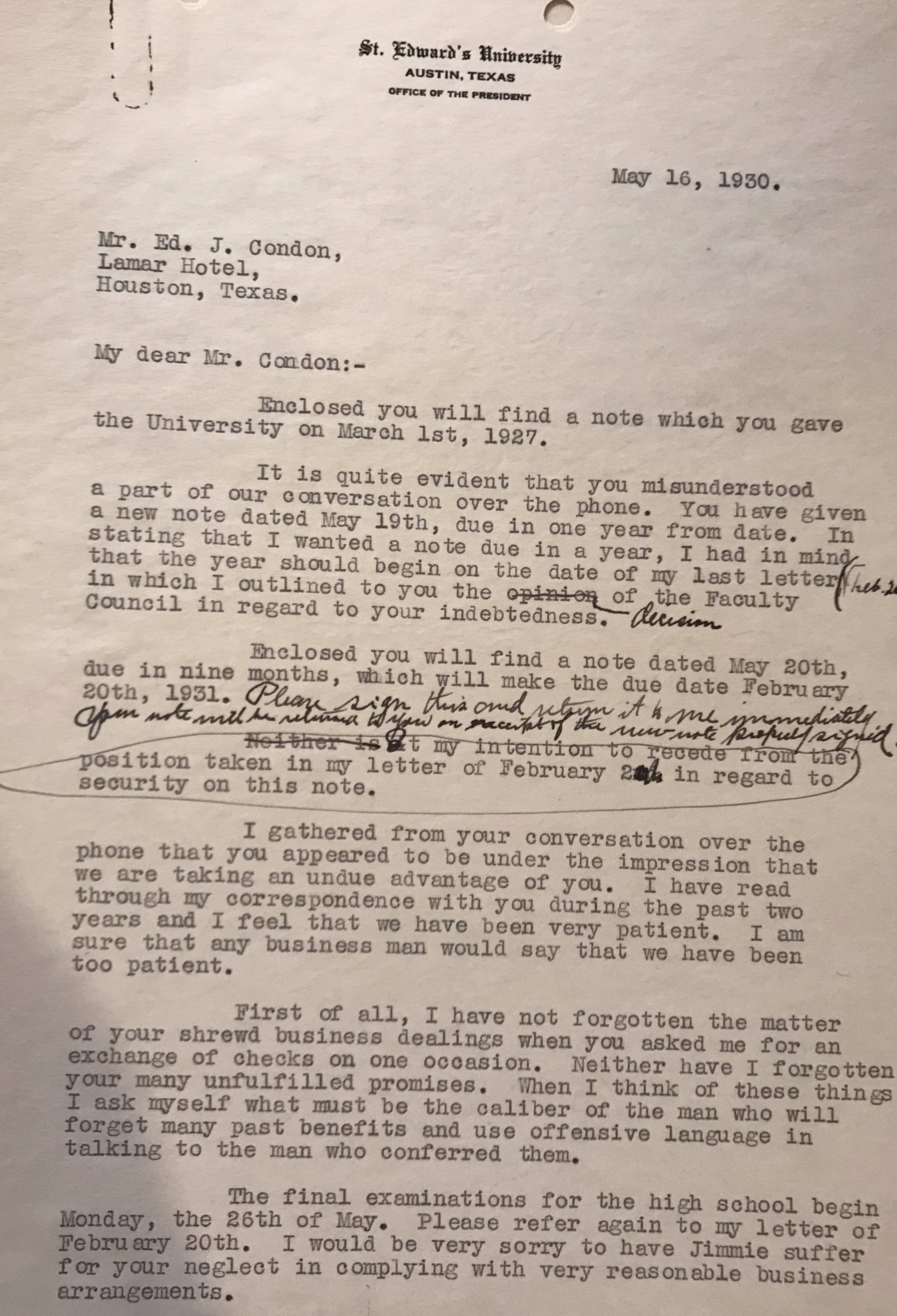 Correspondence from University President sent to Edward J. Condon in regards to his childrens' outstanding tuition bills. Burke states that Jimmie, one of E.J. Condon's sons, will not be permitted to take his final examinations if the debt is not settled.