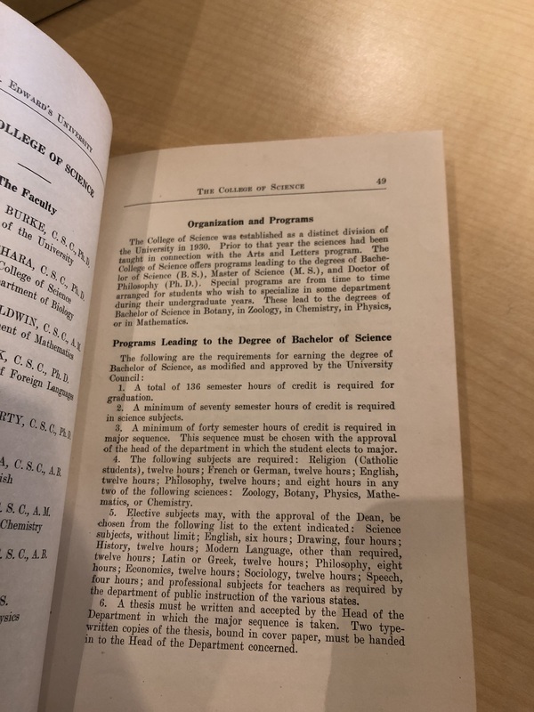 The Official Bulletin of St. Edward's University encloses a calendar, admission requirements, tuition and fees, announcements for the next school year, buildings at the school, degree plans, specialized programs, faculty, and classes being offered.
