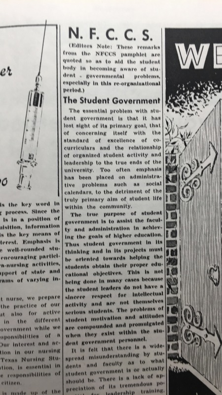 This news clipping describes the goals of and purpose of the student government as stated by the National Federation of Catholic College Students, as well as grievances that those matters are not being met.