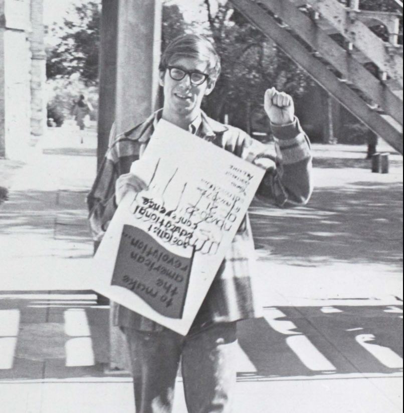 Yearbook photo taken outside of the Main Building of a student holding sign about Socialist Educational Conference.